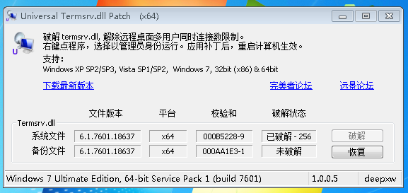 这个补丁的功能就是去除这个限制,允许多人多用户同时并行访问登录XP/Vista/7,拥有一个终端服务器的功能。