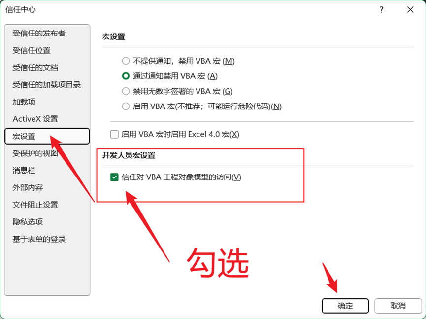 - 勾选“信任对VBA项目对象模型的访问”。
