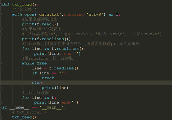分别使用了read全部读取 readlines全部读取且封装到列表中 readlines全部读取且分行显示 readline分行读取 for循环一行一行读取