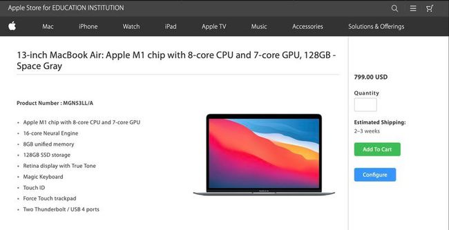 11 月 20 日消息 根据外媒 Macrumors 的消息,今天,苹果美国教育机构硬件和软件价格表上出现了一款配置为 128GB 的 M1 芯片 MacBook Air,售价 799 美元,比 256GB 版本的教育商店价低 100 美元。