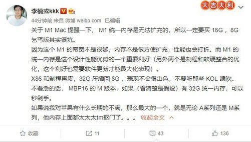 M1 Mac在上市发货之后,好评不断,可能是Win10 ARM太过糟糕,对比之下,ARM Mac显得好了太多。可能是担心粉丝盲目入手,李楠发微博提醒“关于M1 Mac提醒一下,M1统一内存是无法扩充的,所以一定要买16G,8G乞丐版其实很坑。”