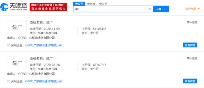 天眼查App显示,OPPO关联公司广东移动通信有限公司已于11月9日申请注册“绿厂”商标,该商标国际分类为“科学仪器”,商标状态为“商标申请中”。