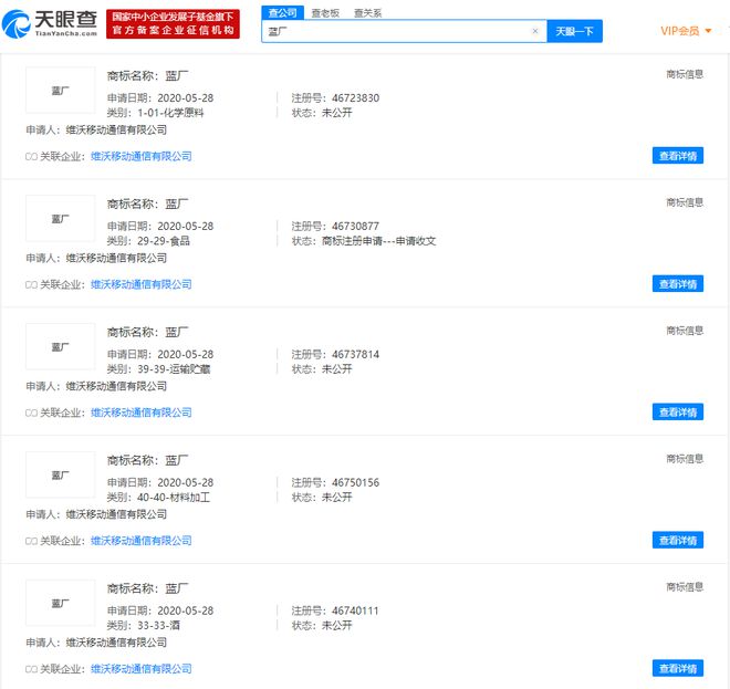 此外,天眼查App显示,早在2019年8月,vivo关联公司维沃移动通信有限公司就已注册“蓝厂”商标,国际分类为“通讯服务”、“网站服务”等,商标状态为“已注册”。另外,该公司还于今年5月还申请注册了数十条“蓝厂”商标,涉及餐饮住宿、日化用品、金融物管等多个国际分类。