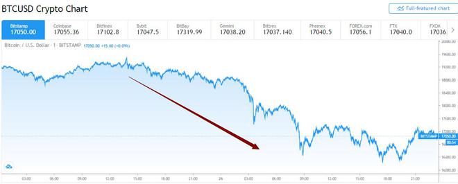 受该传闻影响,比特币(BTC)交易价高位急跌,一度跌破1.63万美元,较亚市早盘接近1.9万美元的日内高位跌去2700多美元,24小时跌幅曾在13%左右,成交额突破375亿美元。