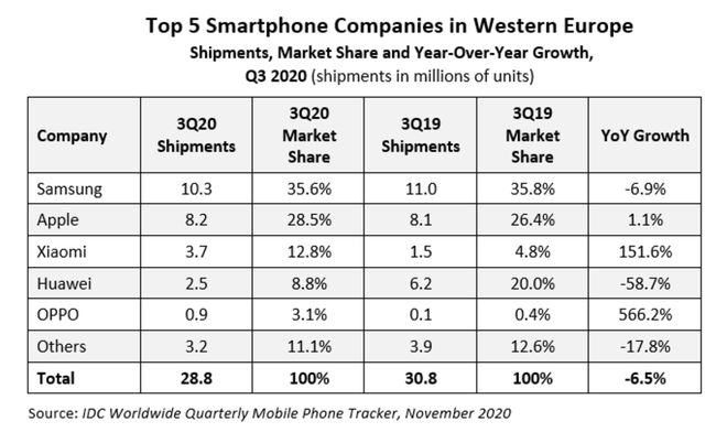 11月26日,由于新冠肺炎疫情导致西欧几个最大经济体采取封锁措施,智能手机市场在第三季度遭遇重挫。