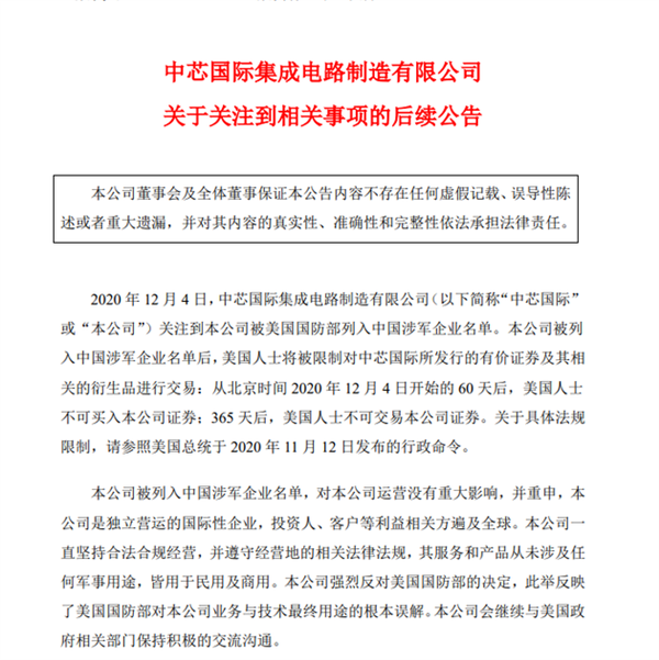 中芯国际称,本公司被列入中国涉军企业名单,对本公司运营没有重大影响。本公司重申,本公司是独立营运的国际性企业,投资人、客户等利益相关方遍及全球。