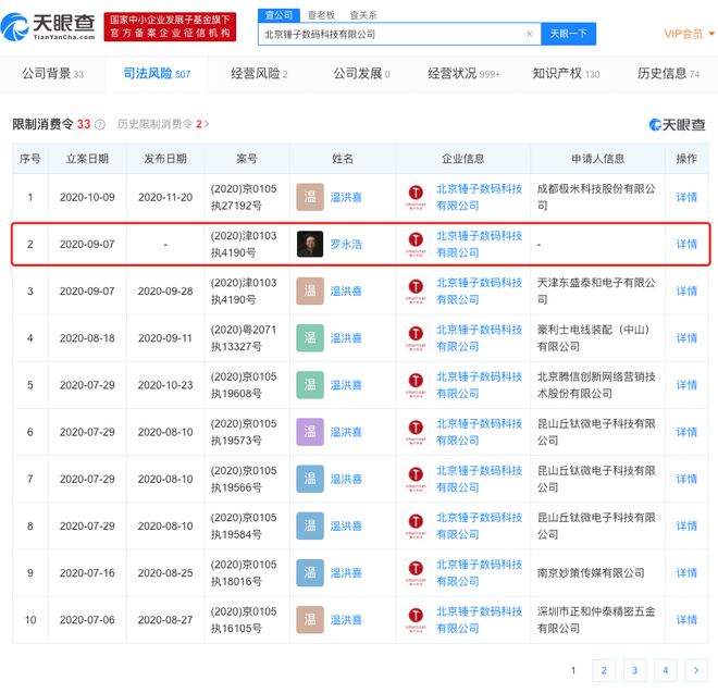 天眼查App显示,近日,北京锤子数码科技有限公司新增一则被限制消费信息。该限制消费令案号为(2020)津0103执4190号,立案日期为2020年9月7日,被限制消费人员为罗永浩。
