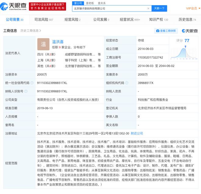 北京锤子数码科技有限公司成立于2014年6月,注册资本为2000万,法定代表人为温洪喜,公司经营范围包含技术开发、技术服务、技术咨询、技术转让、技术推广、技术培训等。