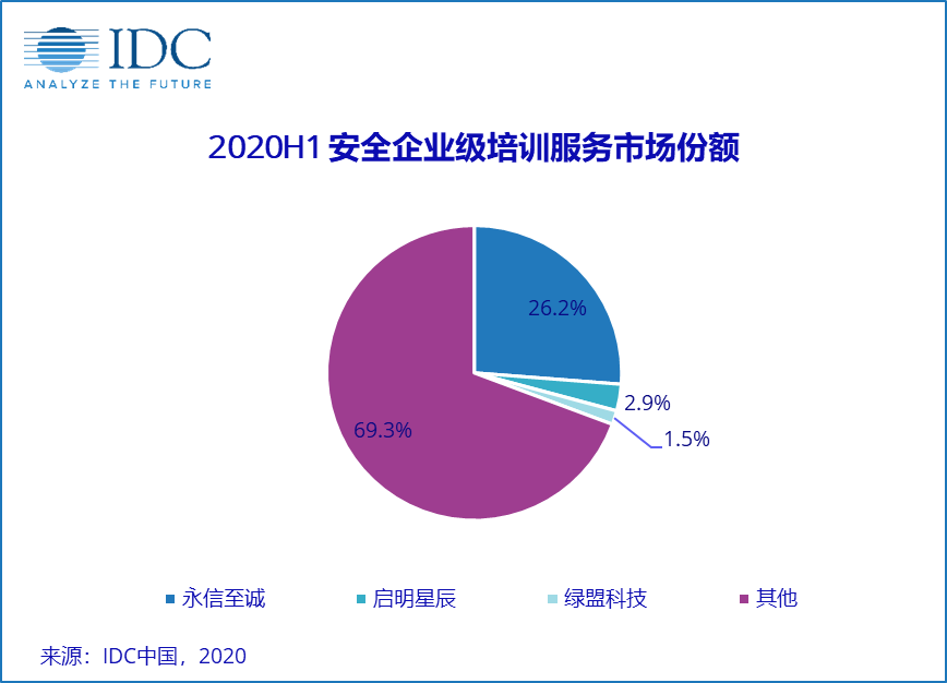 此外,IT安全教育与培训服务是一个教育活动和过程,其中包括企业级培训服务(包括安全意识培训、安全技能培训、大型赛事等服务)、教育认证(包括认证培训、认证考试等)和高校教育三个子市场。2020上半年,在企业级培训服务市场中,永信至诚市场份额为26.2%,启明星辰和绿盟科技市场占有率分别为2.9%和1.5%。