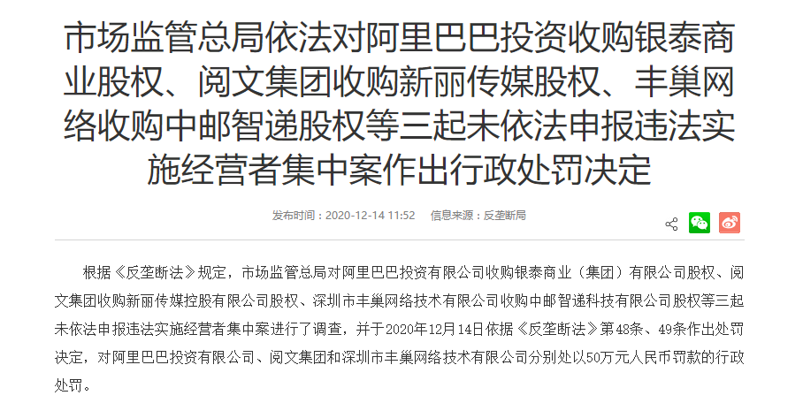 据市场监管总局网站消息,根据《反垄断法》规定,市场监管总局对阿里巴巴投资有限公司收购银泰商业(集团)有限公司股权、阅文集团收购新丽传媒控股有限公司股权、深圳市丰巢网络技术有限公司收购中邮智递科技有限公司股权等三起未依法申报违法实施经营者集中案进行了调查,并于2020年12月14日依据《反垄断法》第48条、49条作出处罚决定,对阿里巴巴投资有限公司、阅文集团和深圳市丰巢网络技术有限公司分别处以50万元人民币罚款的行政处罚。