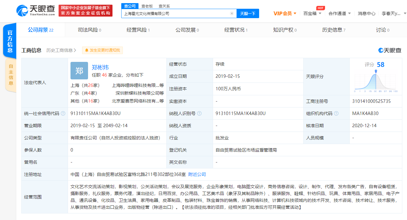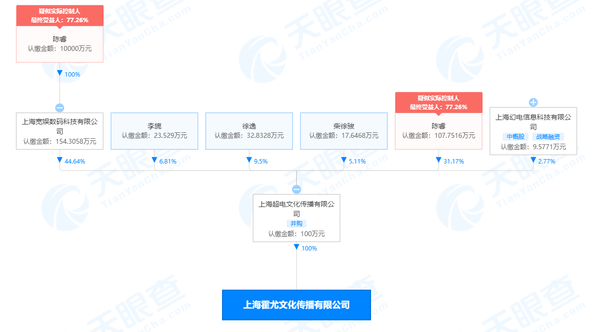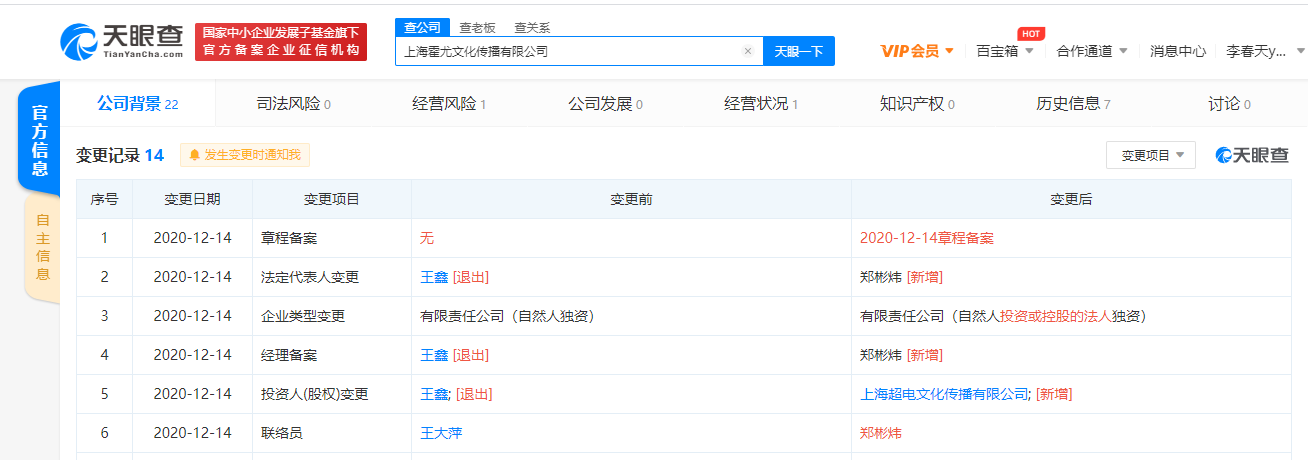 12月16日消息,天眼查App显示,12月14日,上海霍尤文化传播有限公司发生工商变更,原自然人股东王鑫退出,新增股东上海超电文化传播有限公司,持股比例100%,后者第一大股东为B站CEO陈睿担任法定代表人的上海宽娱数码科技有限公司。此外,另外股东中还包括了上海幻电信息科技有限公司。