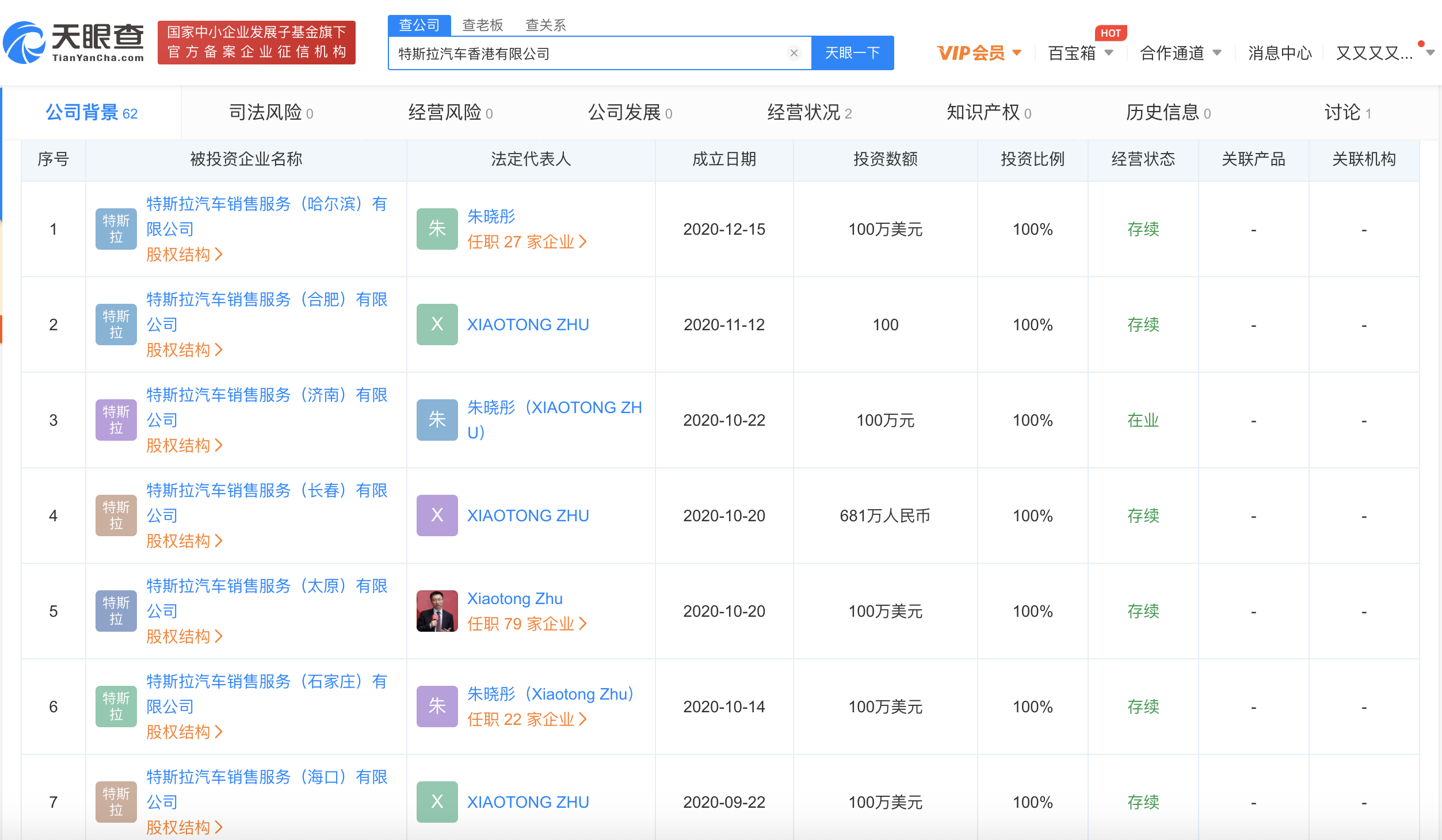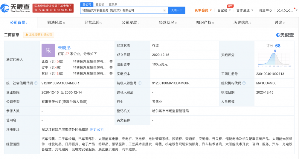 特斯拉汽车销售服务(哈尔滨)有限公司成立于2020年12月15日,注册资本为100万美元,法定代表人为朱晓彤,经营范围包含汽车销售、二手车经销,汽车零部件、太阳能充电器、充电桩、充电柜等。该公司由特斯拉汽车香港有限公司全资持股。