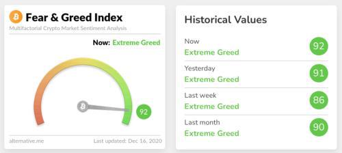 Alternative.me情绪调查显示,12月16日,加密市场的交易情绪已维持“极度贪婪”有一月之久。该指标超过75即为“极度贪婪”,而目前这一数值已达92,创下年内新高。从历史数据来看,近期市场的贪婪交易情绪也已接近历史最高点。