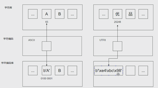 字符库:A、B每个字符有一个代码点如A是65 B为66,这种是方便人类读写的形式,但是最终需要存入计算机的CPU和内存,需要转换成字节的二进制,就涉及到字节的编码。
