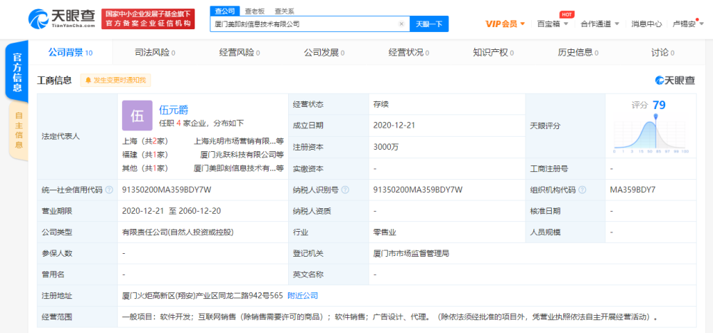 据天眼查APP显示,2020年12月21日,厦门美即刻信息技术有限公司成立,注册资本3000万元人民币,法定代表人为伍元爵,经营范围包括软件开发;互联网销售;软件销售;广告设计、代理等。天眼查股权穿透显示,厦门美即刻信息技术有限公司最大股东为上海兆明市场营销有限公司,持股比例60%,其他两大股东为厦门美图网科技有限公司和王志全,分别持股30%和10%。
