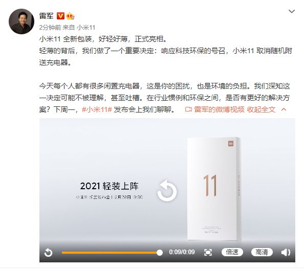 26日,雷军在微博刚刚宣布,响应环保的号召,小米11取消随机附送充电器,小米11的新包装更轻薄。随后雷军又表示,希望得到大家支持。