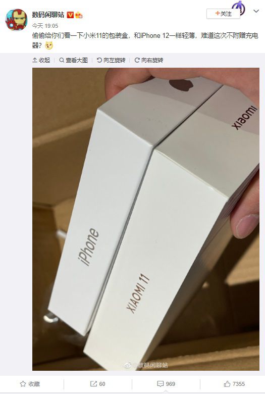 根据数码博主 @数码闲聊站 的消息,小米11的包装盒和iPhone 12的一样薄,之后该博主在评论中表示盒中确无充电器。