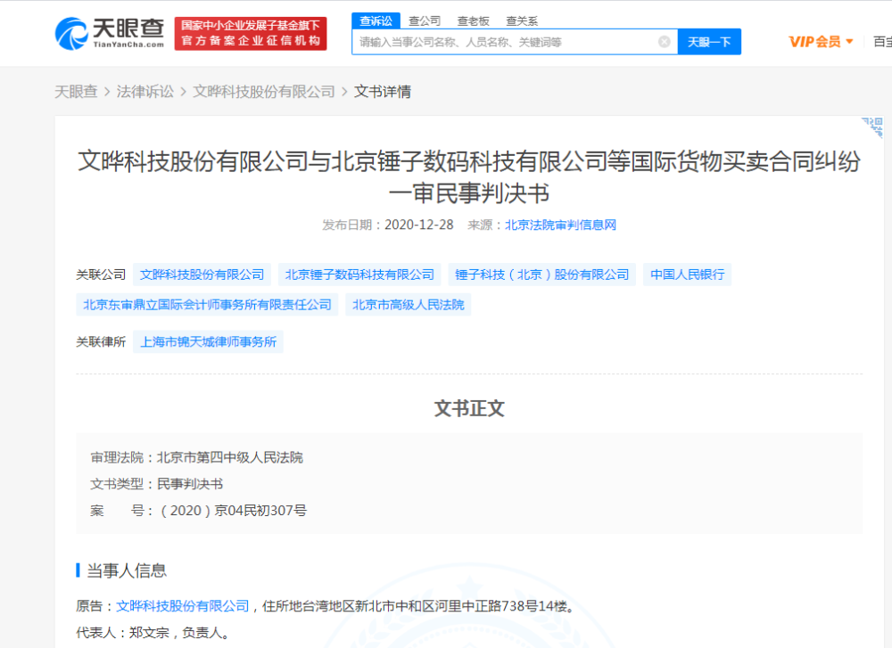 12月28日消息,据天眼查App显示,北京法院审判信息网公布了一则买卖合同纠纷一审民事判决书。