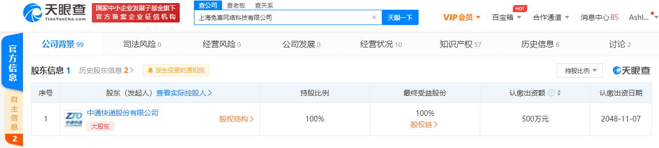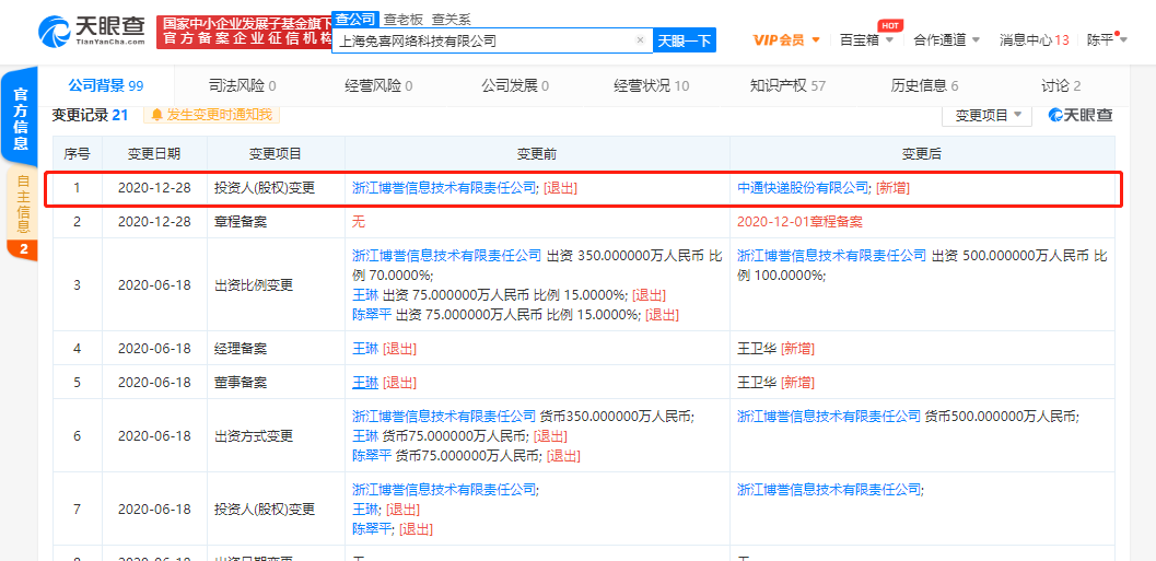 1月4日消息,天眼查App显示,12月28日,上海兔喜网络科技有限公司发生工商变更,原股东浙江博誉信息技术有限责任公司退出,新增股东中通快递股份有限公司,持股100%。