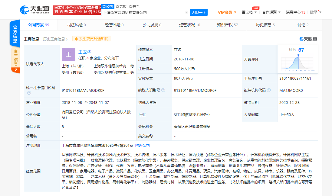 上海兔喜网络科技有限公司成立于2018年11月,注册资本500万人民币,法定代表人王卫华,经营范围包含从事网络科技、计算机技术领域内技术开发、技术咨询、技术服务、技术转让,国内快递(邮政企业专营业务除外)等。
