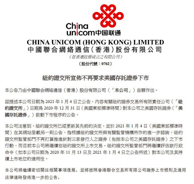 中国联通发布公告称,本公司注意到,纽约证交所已经更新其先前的决定,指根据纽约证交所与有关监管机构所作的进一步咨询,纽约证交所监管部门不再打算推进针对三家发行人之证券(包括本公司之美国存托证券)之下市行动,而目前本公司将继续在纽约证交所上市交易。