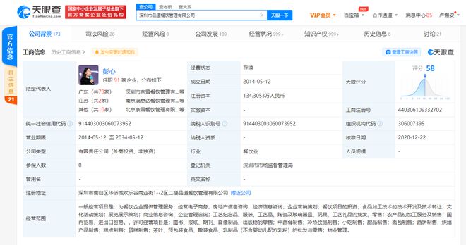 奈雪的茶关联公司为深圳市品道餐饮管理有限公司,该公司成立于2014年5月,注册资本约为134万人民币,法定代表人为彭心。公司经营范围包括:为餐饮企业提供管理服务;经营电子商务,房地产信息咨询;经济信息咨询;企业营销策划;餐饮项目的投资;食品加工技术的技术开发及技术转让等。