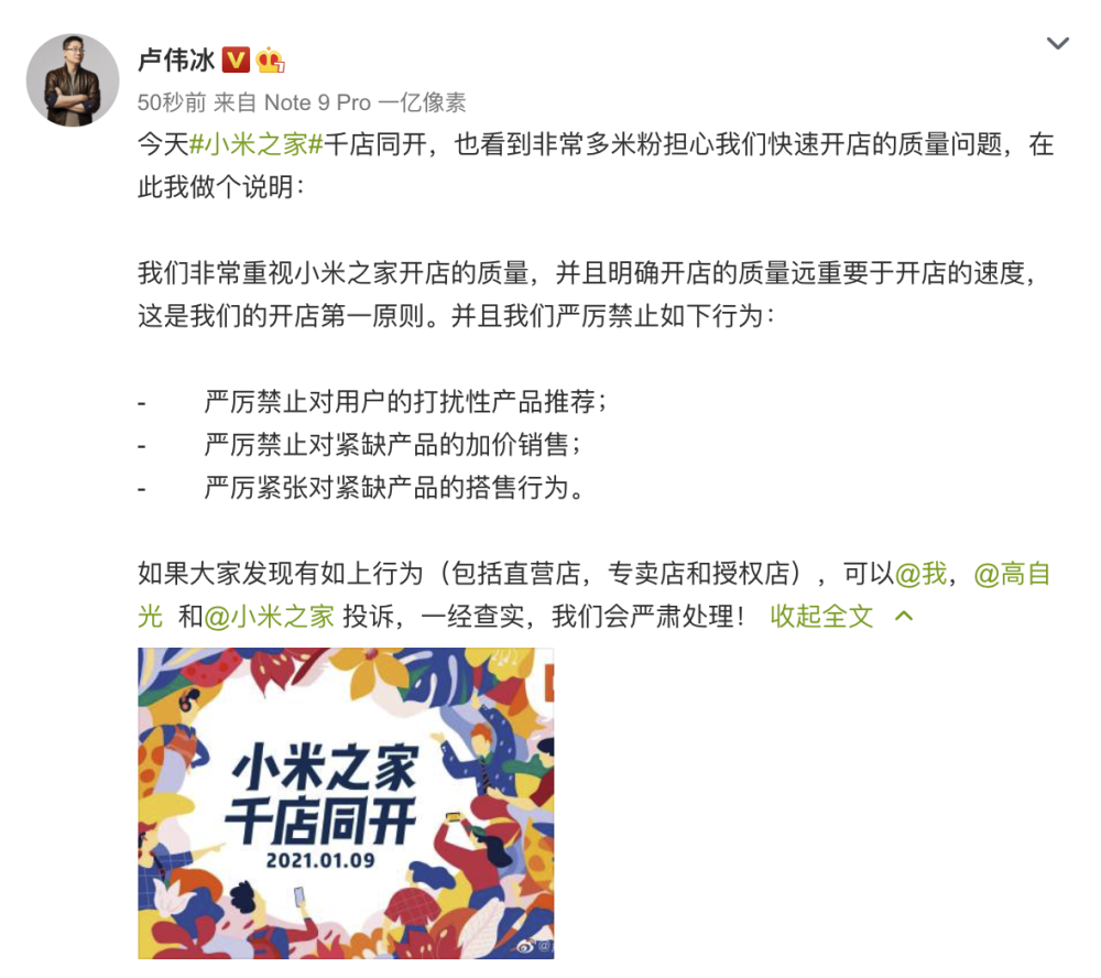针对快速开店的质量问题,小米集团副总裁,中国区总裁卢伟冰1月9日通过个人微博回应称:“我们非常重视小米之家开店的质量,并且明确开店的质量远重要于开店的速度,这是我们的开店第一原则。”