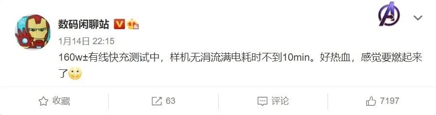 1 月 15 日消息 据消息一向比较可靠的爆料人 @数码闲聊站 爆料,国内厂商正在测试 160w± 有线快充,样机无涓流满电耗时不到 10 分钟。