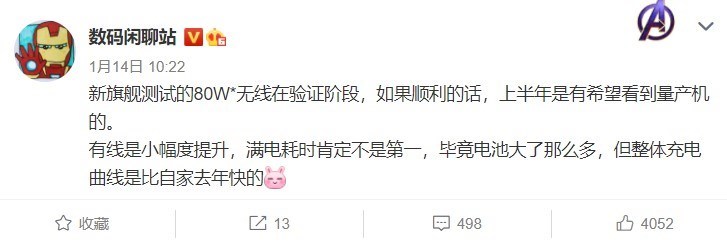 IT之家了解到,昨天早些时候该博主还透露,小米新旗舰正在测试 80W 无线充电技术,并且有希望在今年上半年实现量产。