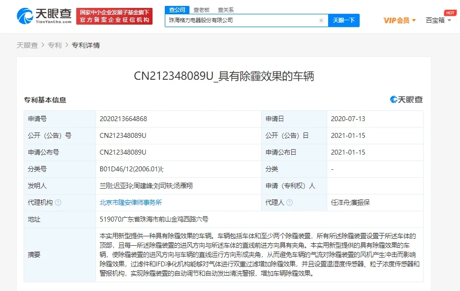 天眼查APP显示,2021年1月15日,珠海格力电器股份有限公司公开一项名为“具有除霾效果的车辆”的专利,公开号为CN212348089U,申请日为2020年7月。