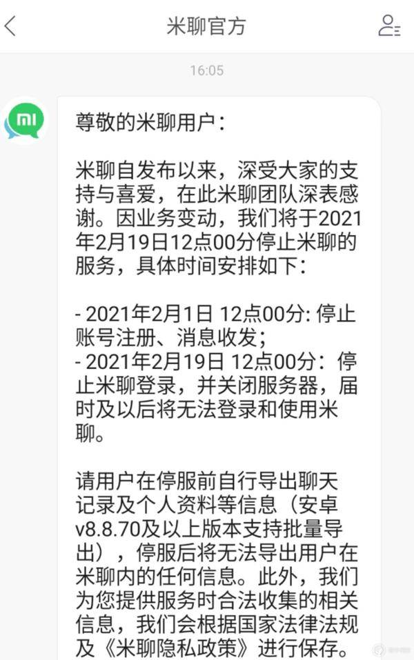 公告表示:将在2021年2月1日12点00分 : 停止账号注册、消息收发;2021年2月 19日12点00分:停止米聊登录,并关闭服务器,届时及以后将无法登录和使用米聊。请用户在停服前自行导出聊天记录及个人资料等信息,停服后将无法导出用户在米聊内的任何信息。
