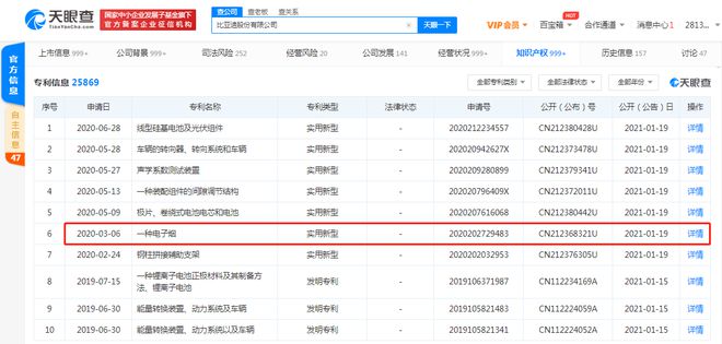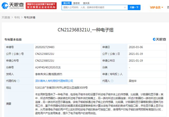 天眼查App显示,1月19日,比亚迪股份有限公司公开一项名为“一种电子烟”的专利,公开号为CN212368321U,申请日为2020年3月6日。