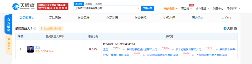 据天眼查APP显示,2021年1月20日,上海顺丰电子商务有限公司成立,该公司注册资本1000万人民币,法定代表人为王文俊,公司经营范围含进出口代理;道路货物运输;互联网销售;国际货物运输代理;机械设备租赁等。天眼查股东信息显示,该公司由顺丰关联公司深圳顺丰国际实业有限公司全资持股,王卫为该公司疑似实际控制人。