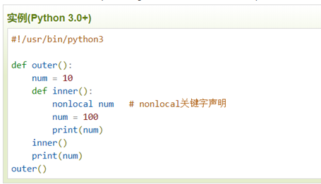 如果要修改嵌套作用域(enclosing 作用域,外层非全局作用域)中的变量则需要 nonlocal 关键字了,如下实例: