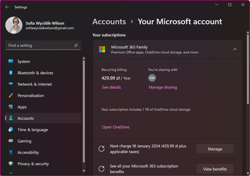 假设你已经安装了Windows 11的最新Beta版和Release Preview版,启动”设置”应用程序,进入”账户”部分。你会看到”你的微软账户”子部分,从这里你可以看到你可能拥有的订阅信息,查看和改变你的支付设置,还可以查看微软返利的状态。