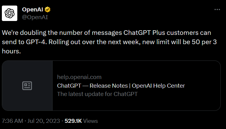 OpenAI官方宣布将把ChatGPT Plus用户发送到GPT-4的对话数量增加一倍。新上限将在下周推出,即每3小时50条。在GPT-4模式中,每3小时的信息限制从25条扩大到50条,这对用户和开发人员都有好处。