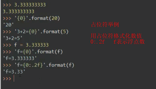 占位符:’{0}’.format(f) 单引号+大括号+数值+format()