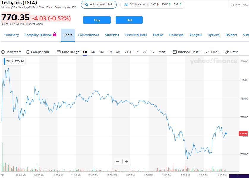 芒格表态后,本周三高开低走的特斯拉股价跌幅扩大,一度跌破764美元刷新日低,日内跌幅扩大到1%以上。周三盘初,特斯拉曾逼近790美元,日内涨幅约2%。