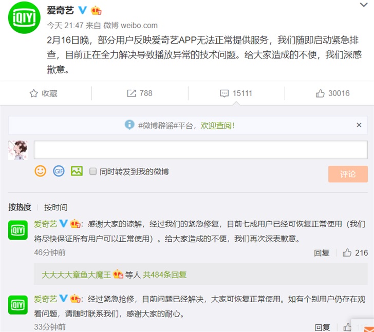 爱奇艺再回应大范围崩溃:问题已解决,现可正常使用