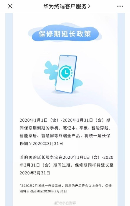 此外,若购买的延长服务宝在2020年1月1日(含)-2020年3月31日(含)期间过期,保修期同样将延长至2020年3月31日。华为表示,2020年2月将统一升级系统,若用户的产品符合以上条件,保修期将自动延期至2020年3月31日。