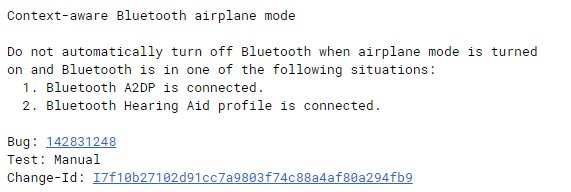 今天报道了谷歌提前发布Android 11首个开发者预览版的消息,目前有更多关于Android 11的信息流出,一位XDA用户发现了一个AOSP Gerrit条目,该条目涉及到一个新的“情境感知蓝牙飞行模式”,当手机连接蓝牙耳机或助听器时,打开飞行模式,蓝牙将不会关闭。