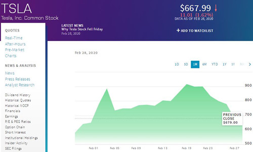 美股三大股指本周大幅下滑,众多科技巨头的股价也持续大幅下跌,电动汽车厂商特斯拉就是其中之一,其股价在本周的5个交易日连续下跌,市值缩水超过400亿美元。周五美国股市收盘时,特斯拉股价为667.99美元,较前一交易日收盘时的679美元下跌11.01美元,跌幅为1.62%。
