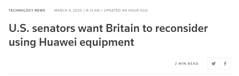 据路透社3月4日消息,美国20名参议员于当地时间3月3日签署联名信,要求英国立法者重新考虑是否使用华为的决定。这是美国反对英国计划使用华为设备的最新动作。