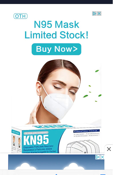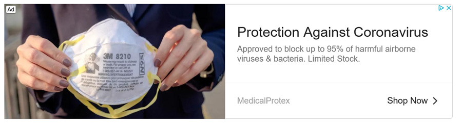 比如,CNBC记者发现,谷歌展示了“预防新型冠状病毒”的口罩广告,并称这是“政府认证阻止高达95%的空气传播病毒和细菌,库存有限”。广告照片上展示了一个3M口罩,跳转网页清单中称该产品为“美国国家职业安全与健康研究所认证”,但实际上这个清单是一个名为“MedicalProtex”的网站展示的。