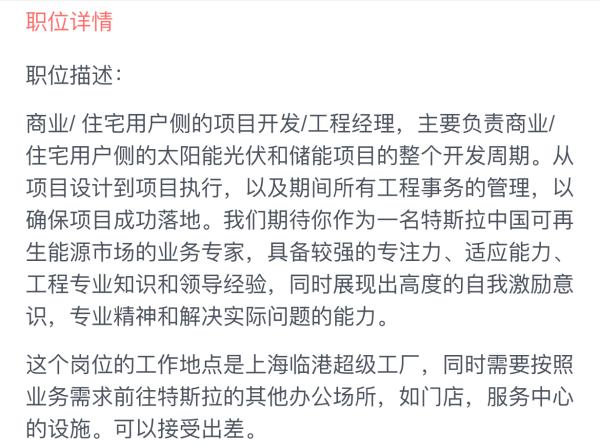 澎湃新闻3月6日搜索特斯拉中国官方招聘微信平台看到,特斯拉能源部门近日已发布“商业/住宅用户侧”相关的项目开发工程经理、业务拓展经理职务,工作地点在上海临港超级工厂,同时需要按照业务需求前往特斯拉的其他办公场所。其中,商业/住宅用户侧的项目开发/工程经理的职责为负责商业/住宅用户侧的太阳能光伏和储能项目的整个开发周期。