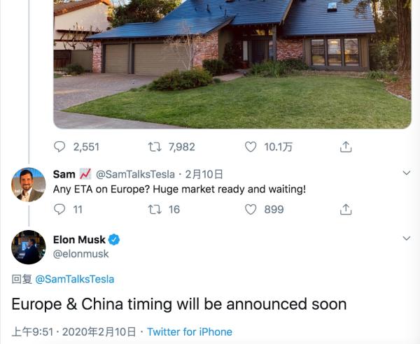 2月10日马斯克在推特上证实将向欧洲和中国拓展太阳能屋顶业务