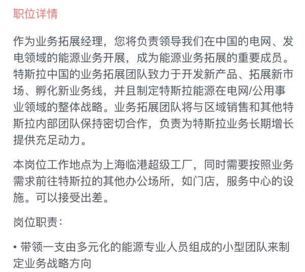 特斯拉招聘的“商业/住宅用户侧”业务拓展经理职务包括“拓展新市场、孵化新业务线”