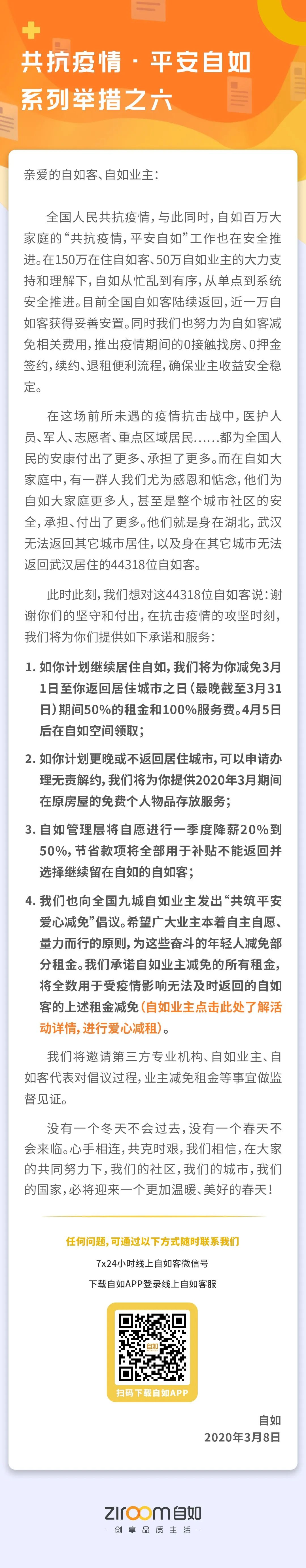 在此之前,自如推出的多项举错包括:协助社区和相关政府部门收集租客返程信息;按时为业主支付租金;为全国150万在住租客减免2月50%服务费;为近5万武汉租客减免2月一半租金及全月服务费约3000万元;为符合相应条件的返程租客提供安置房源;上线短续优惠、0押金签约等。