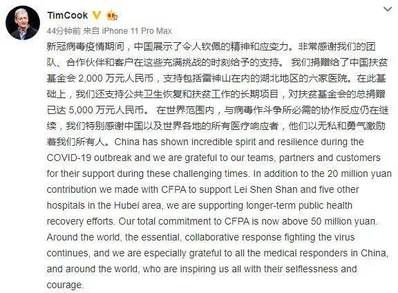 4月1日,苹果CEO蒂姆·库克在微博上发文称,新冠病毒疫情期间,中国展示了令人钦佩的精神和应变力,已经向相关机构的总捐赠已经达到5000万人民币。