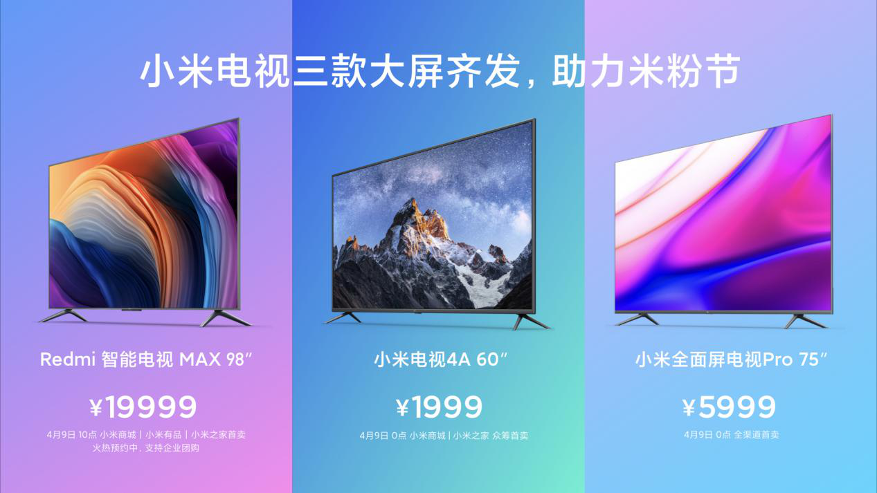 据了解,这次又有上周已发布的Redmi智能电视MAX 98”,另一款产品为小米电视4A 60英寸,众筹价1999元,此外,还有小米全面屏电视Pro 75英寸发布。